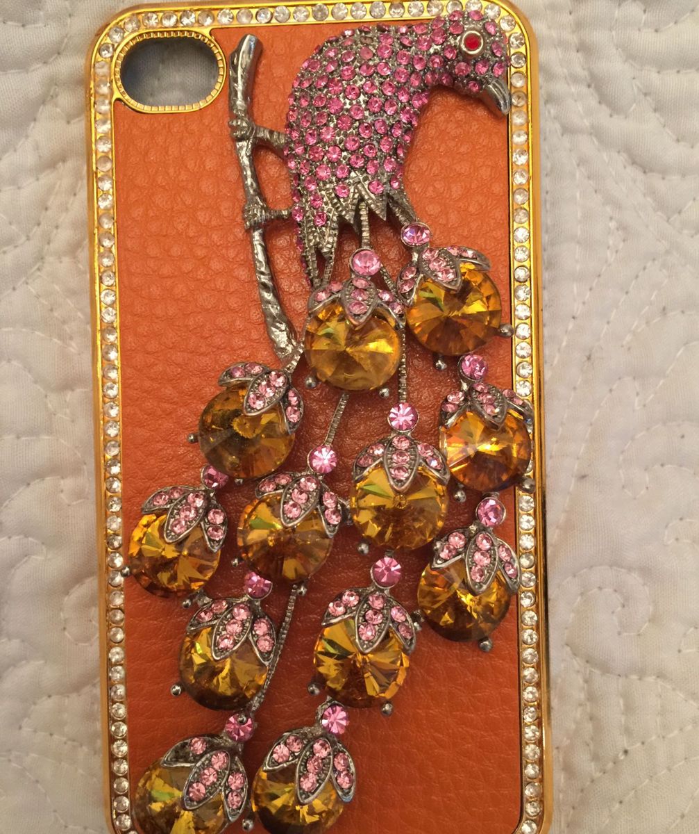 Capa Iphone 4/4s em Pedraria Dourada e Rosa com Fundo Laranja em Couro | Produto Feminino Usado 18221231 | enjoei